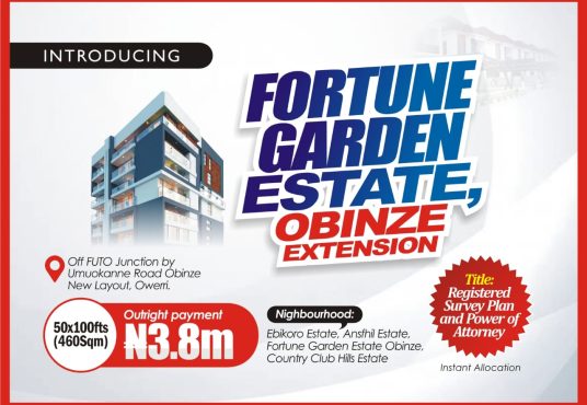 N 3,800,000.00*FORTUNE GARDEN ESTATE Extension* Welcome to Fortune Gardens Estate Obinze, Extension Owerri Imo State. It is an investment destination and choice area for developers and real estate investors. Return on Investment (ROI) is guaranteed. Tested and trusted. This Estate is not just for the first time buyers and young families. Whether you’re starting a family, […]